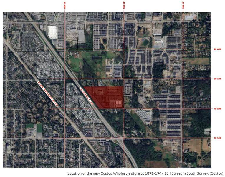 正如Daily Hive Urbanized去年报道的那样,Costco拟在南素里(South Surrey)164街1891-1947号建设新店——位于99号公路东侧的一块空地,介于公路现有的24大道天桥与16大道立交之间。