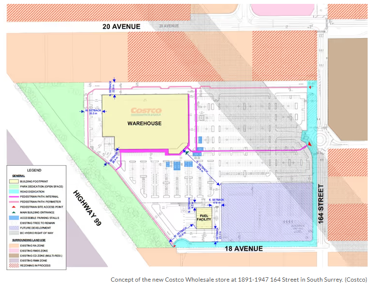 Costco计划将该地从“多户住宅用地”改为“混合就业用地”。主店建筑面积为165,000平方英尺,并配有975个停车位的地面停车场,同时设有Costco加油站——这将成为大温第三家设有加油站的Costco,前两家分别位于兰里(Langley)和高贵林港(Port Coquitlam)。