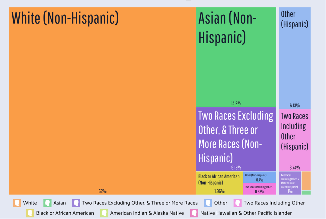 居民以白人为主(62%),同时拥有相当比例的亚裔(14.2%)。