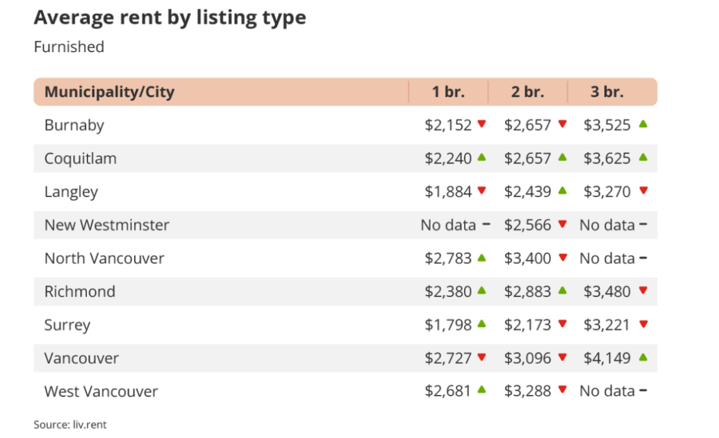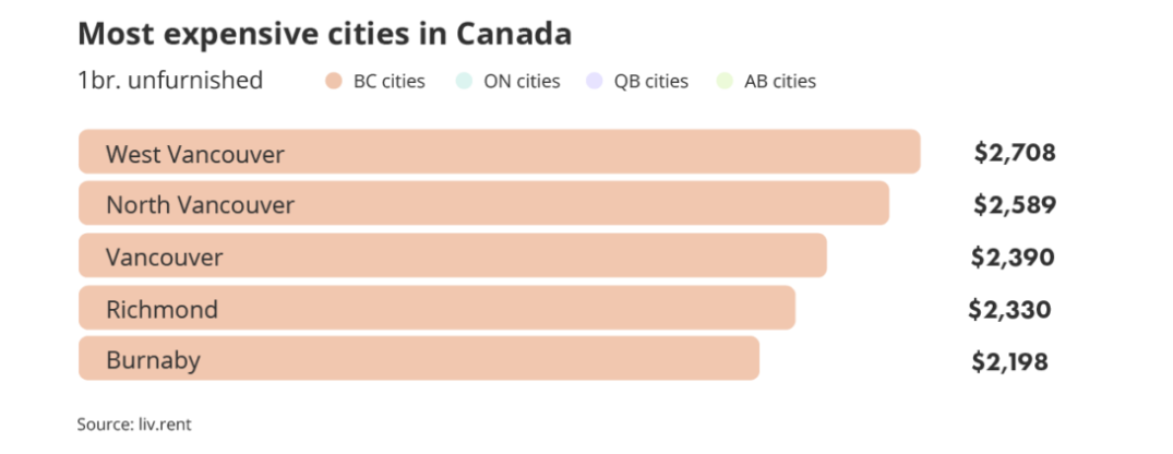 虽然价格有所下降,但毫无悬念,大温依旧稳坐“全加拿大最贵租房市场”的宝座。根据 liv.rent,加拿大最贵租金的前五大城市全部来自大温地区: