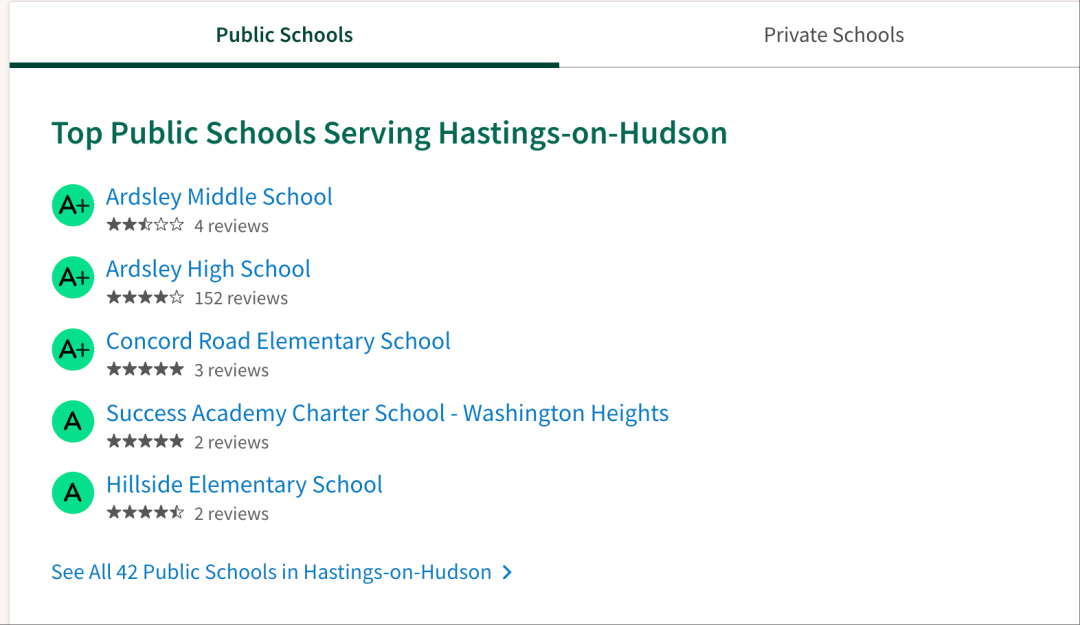 黑斯廷斯隶属于Hastings-on-Hudson Union Free School District(学区)。该学区拥有三所公立学校:Hillside Elementary School(小学)、Farragut Middle School(中学)和 Hastings High School(高中)。