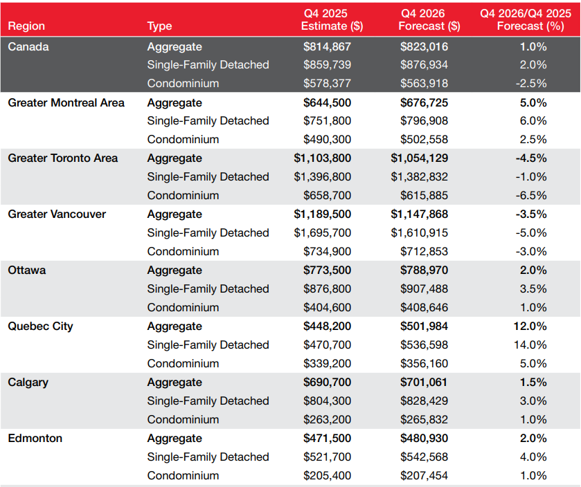 加拿大房屋综合价格(aggregate price)预计在 2026 年第四季度同比仅微升 1.0%,达到 823,016 加元。独立屋(single-family detached)的中位价预计会上涨 2.0% 至 876,934 加元;公寓中位价则预计下跌 2.5% 至 563,918 加元。
