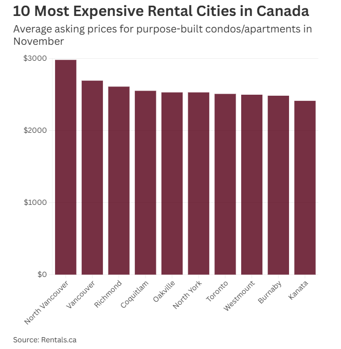 北温哥华继续稳坐全国租金最贵城市的“头号位置”,而前 10 名几乎都被 BC省和安省城市包揽。