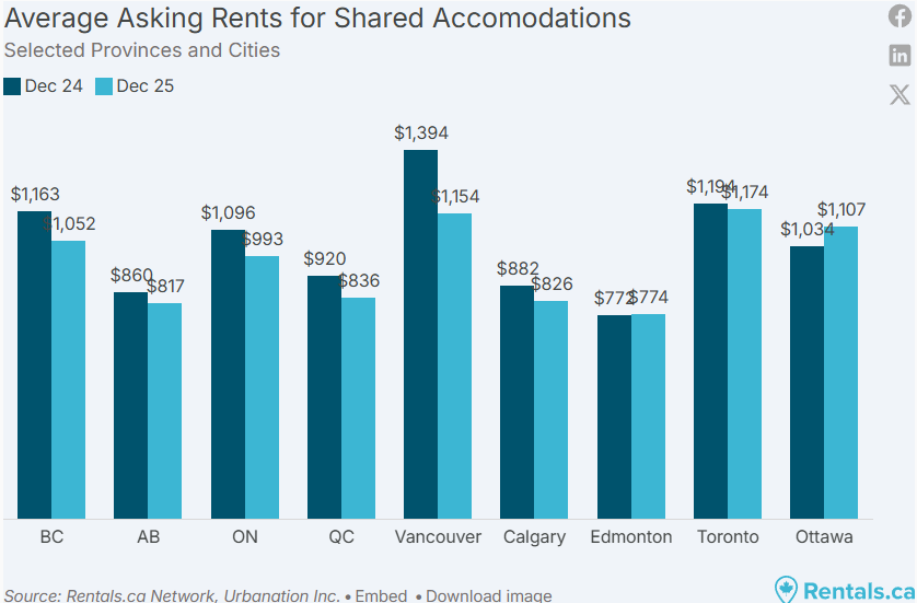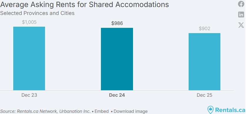 BC 省、阿尔伯塔省、安省和魁北克省的合租平均挂牌租金在 12 月为 902 加元,创下 34 个月以来的新低。合租租金已连续第 13 个月同比下降,同比下跌 8.5%,较两年前下降 10.3%。