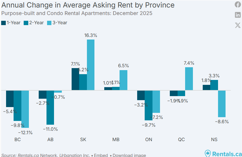 萨斯喀彻温省继续领跑全国租金增长,公寓租金同比上涨 7.1%,过去三年累计上涨 16.3%。