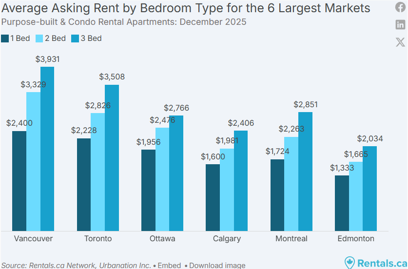 相比之下,三居室租金表现最稳,同比小幅上涨 0.2%,平均为 2,501 加元。