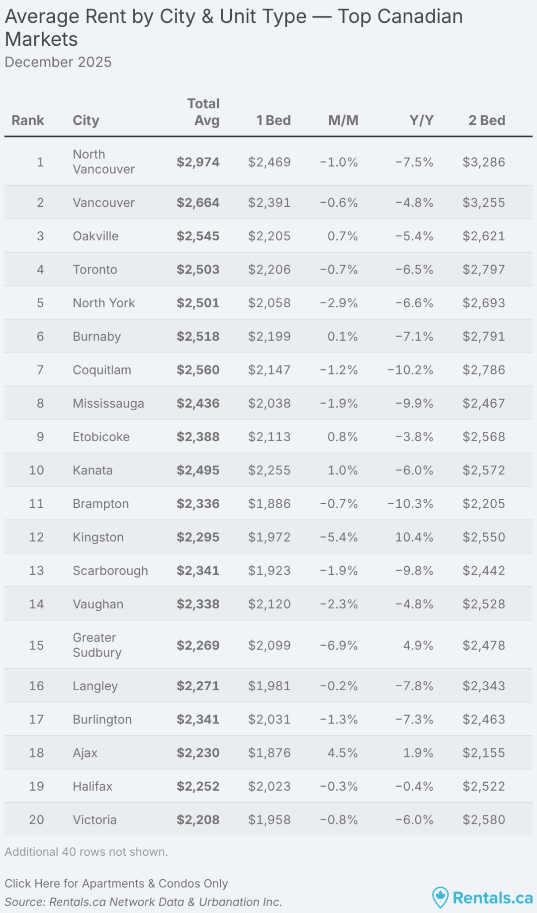 相比之下,专用出租公寓租金相对稳定,同比仅下降 1.0%,平均为 2,049 加元。但需要注意的是,该数据并未完全反映房东普遍采用的优惠措施,例如免租期等,这些实际会进一步拉低有效租金。