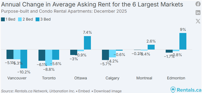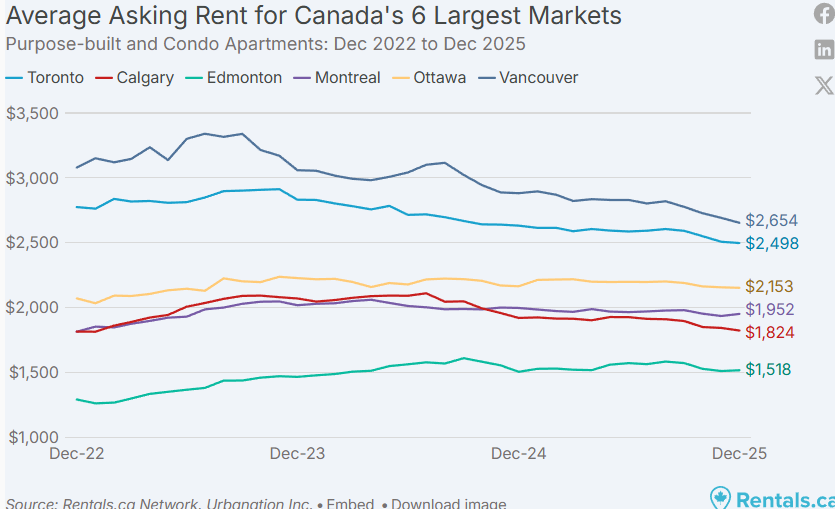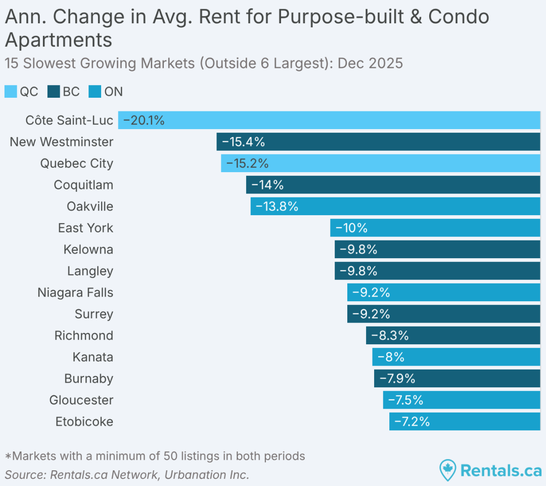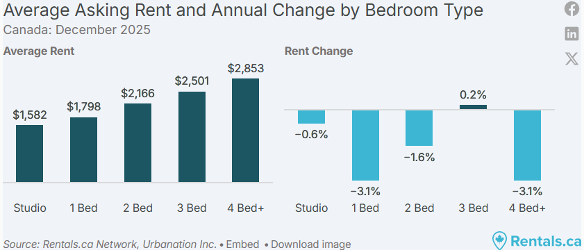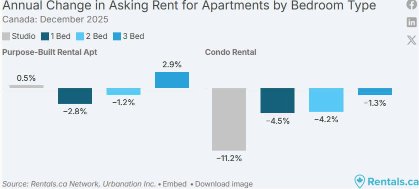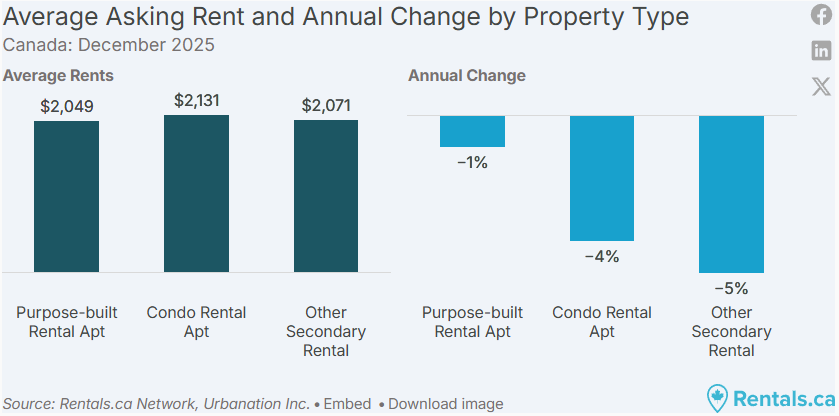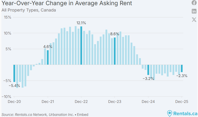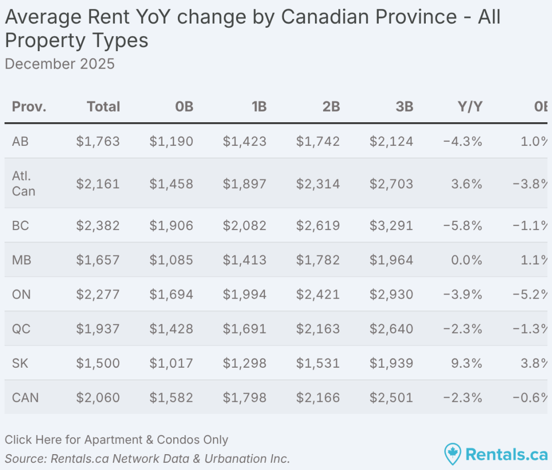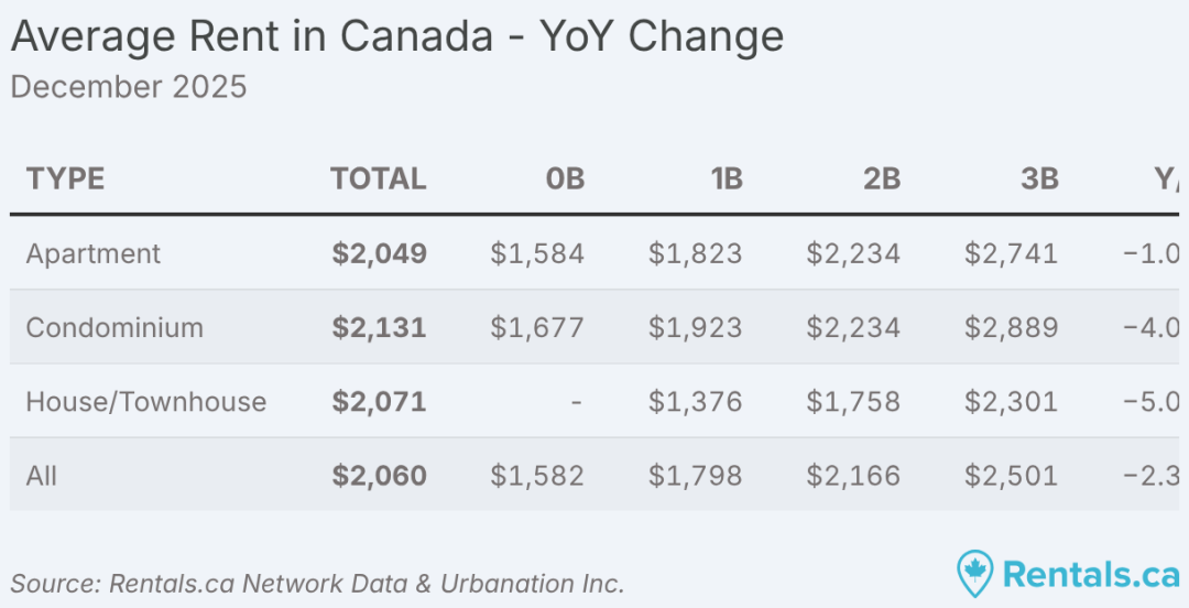 2025 年 12 月,加拿大全国各类物业的平均挂牌租金为 2,060 加元,同比下降 2.3%,这是全国租金连续第 15 个月出现同比下滑。整体来看,租金已降至 30 个月以来的最低点,过去两年累计下降 5.4%。