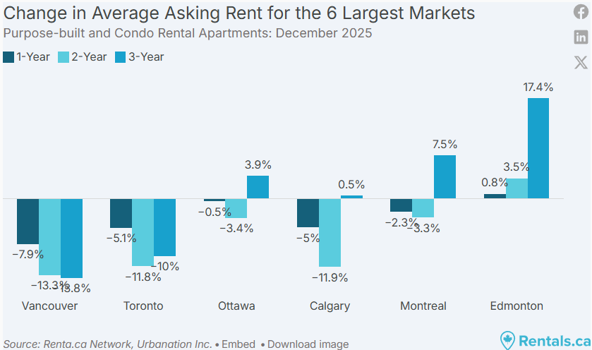 在加拿大六大核心城市中,2025 年公寓租金同比跌幅最大的仍是: