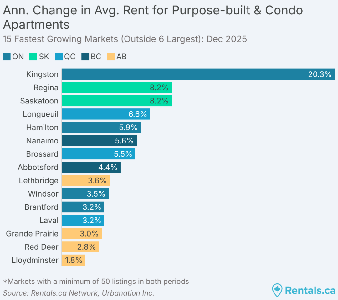 金斯顿(Kingston)继续领跑全国租金涨幅榜,同比大涨 20.3%,平均租金升至 2,282 加元,主要由于新落成高价项目占比上升。