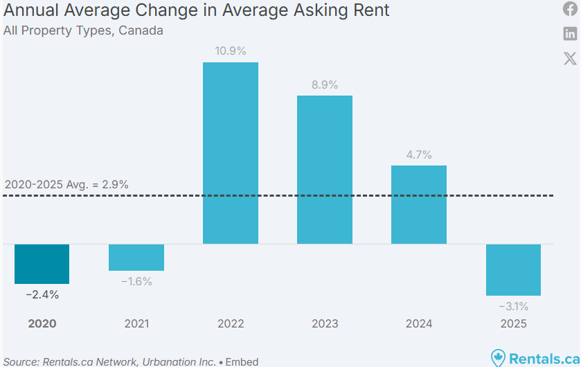 若按全年平均计算,2025 年加拿大挂牌租金同比下降 3.1%,这一跌幅超过了疫情期间的 2020 年(-2.4%)和 2021 年(-1.6%)。尽管 2025 年出现明显回调,但自 2020 年以来的整体租金年均涨幅仍约为 2.9%,与长期历史均值基本一致。