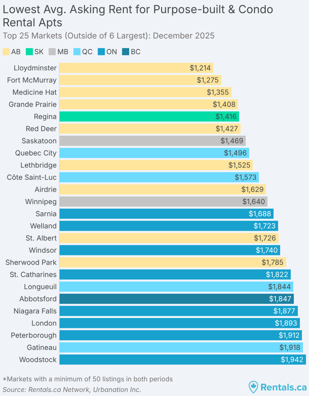 在全国租金最便宜的 10 个城市中,有 8 个位于草原省份,其中前四名全部在阿尔伯塔省:劳埃德明斯特(Lloydminster,1,214 加元)、麦克默里堡(Fort McMurray,1,275 加元)、梅迪辛哈特(Medicine Hat,1,355 加元)和大草原城(Grande Prairie,1,408 加元)。