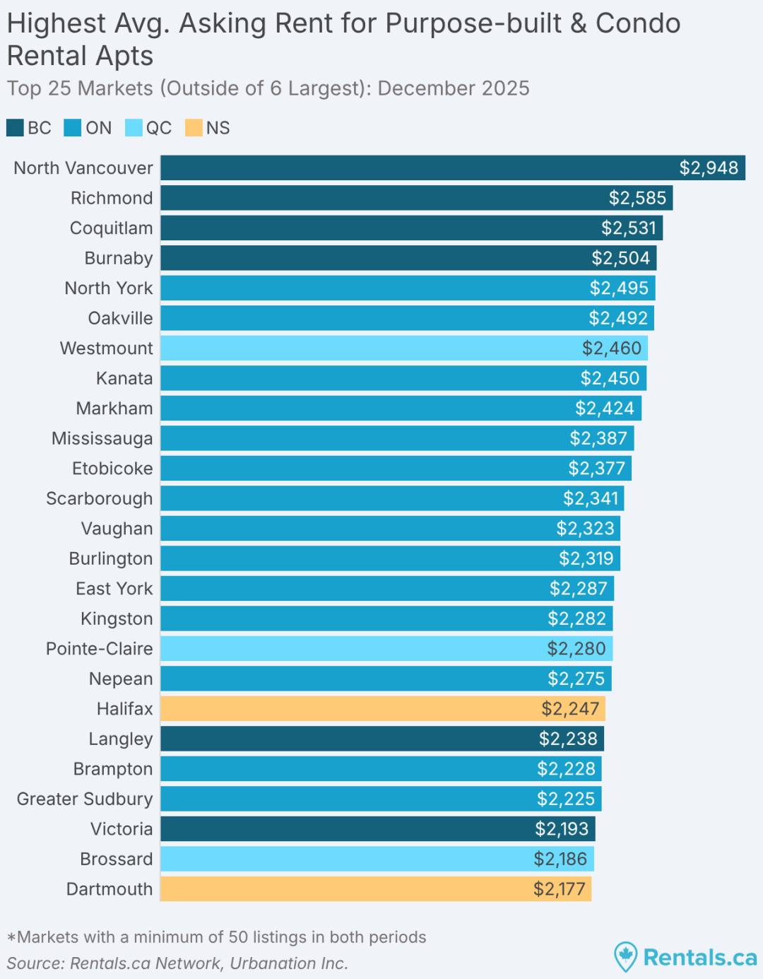 租金最高的前四名均位于 BC 省:北温哥华(North Vancouver,2,948 加元)、列治文(Richmond,2,585 加元)、高贵林(Coquitlam,2,531 加元)和本拿比(Burnaby,2,504 加元)。