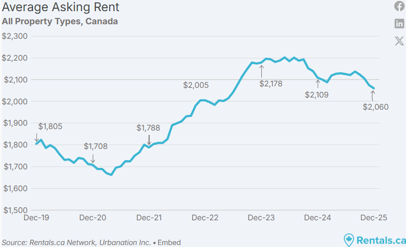 2025 年 12 月,加拿大全国平均挂牌租金降至 2,060 加元,同比下降 2.3%,创下过去两年半以来的最低水平。