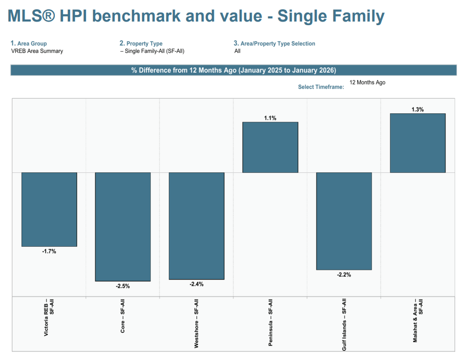 维多利亚核心区(Victoria Core)独立屋MLS®房价指数(HPI)基准价在2025年1月为1,297,300加元,2026年1月下降2.5%至1,265,500加元,但较2025年12月的1,255,000加元有所回升。