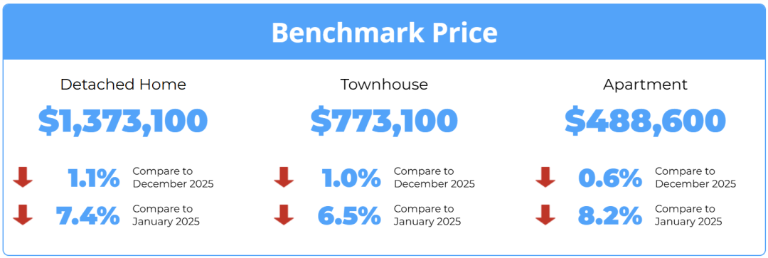 独立屋:基准价为1,373,100加元,较2025年12月下降1.1%,较2025年1月下降7.4%。
