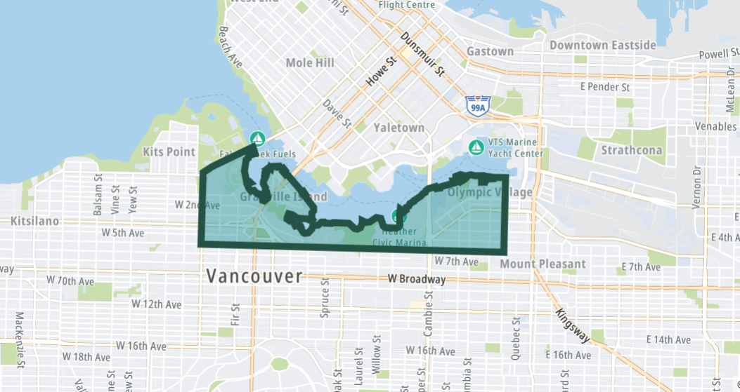 这条位于市中心南侧的狭长水道,把 Downtown 与城市其他区域分隔开来,同时也串联起了 Granville Island、Olympic Village 等多个核心地标。