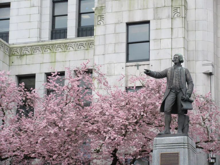 市中心的街道和小公园中也有不少樱花树,尤其是Burrard Street和City Hall周边,城市建筑与粉色樱花形成鲜明对比,适合拍现代都市风的春日照片。