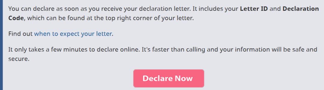 一旦收到申报信件,你就可以通过在线申报系统完成申报。系统会一步步引导你,为每一处房产选择对应的豁免类型。业主们需要用《通知》上的流水号(Letter ID)和申报码(Declaration Code)以及自己的SIN卡号码完成申报。