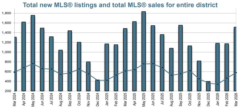 截至2026年3月底,MLS®系统在售房源为3,261套,较2月增加12.3%,较2025年3月的3,023套增长7.9%。
