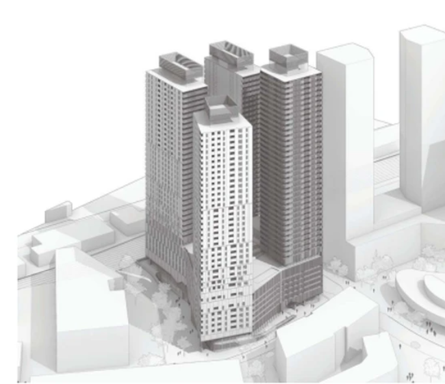 现有新方案提出了一个以交通为导向的项目,将建造更高、住宅单位类型更加多样化的建筑。此次更改土地用途申请包括639套分契公寓、485套出租单位和32套社会住宅。