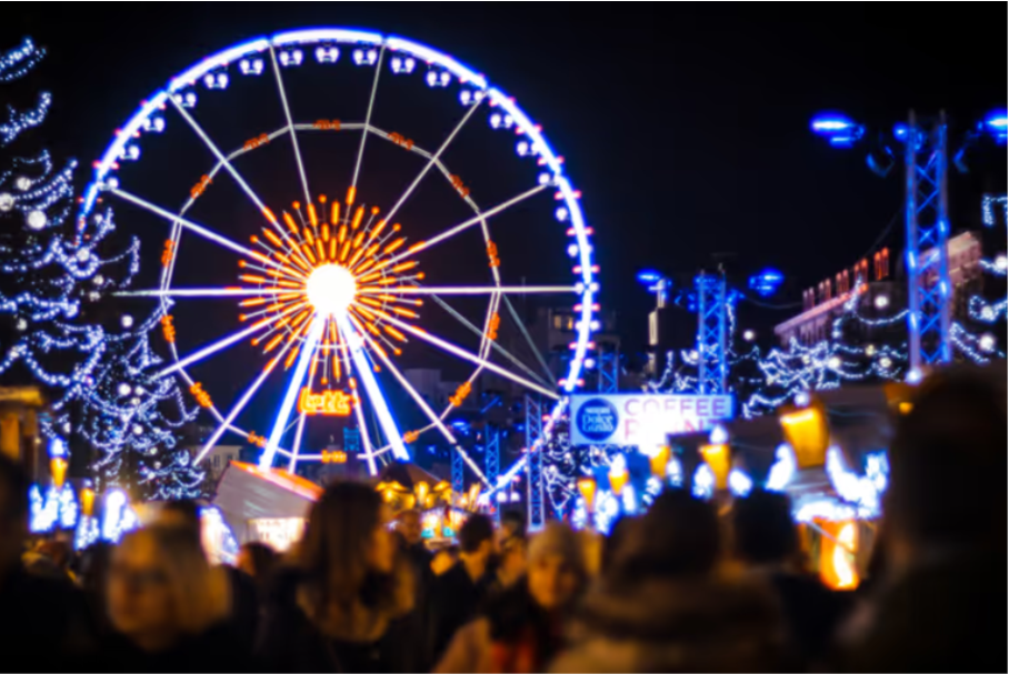 摩天轮位于市中心心脏地带,四周被各种节庆活动簇拥着。从高空俯瞰,整座城市的节日灯光都在脚下闪烁,像一幅冬日限定的光之画卷。