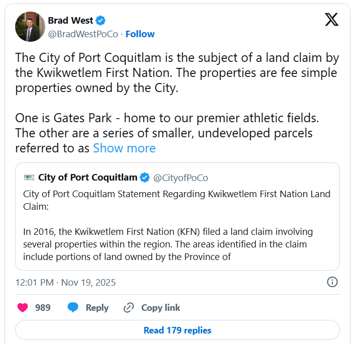 正值由“列治文原住民地权案”引发公众对土地所有权主张的关注度日益提高之时,高贵林港(Port Coquitlam)市政府近日向居民及私人业主发布通知,希望在一项涉及 Kwikwetlem 原住民族的土地声索案持续推进的情况下,向公众提供资讯并安抚情绪:公共土地与私人土地的权利都会受到保护。