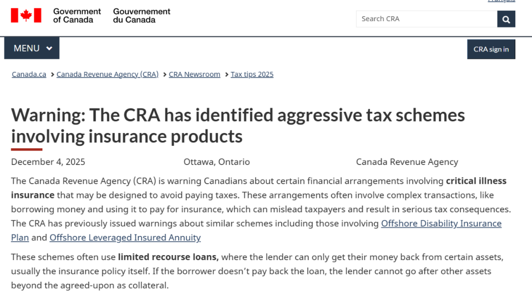 加拿大税务局(CRA)12月4日紧急发布税务警报,点名一类打着“重大疾病保险”(Critical illness insurance)旗号的激进避税安排(Aggressive tax schemes)。CRA警告纳税人切勿参与,否则可能面临巨额罚款、追缴税款,甚至刑事监禁!
