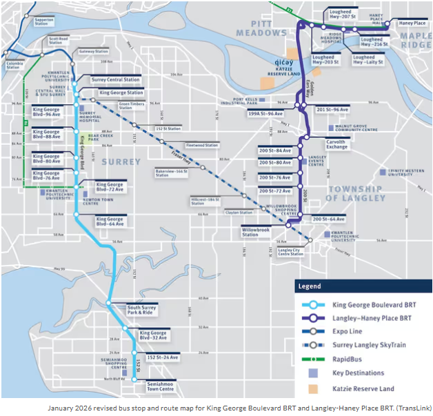 同时他宣布,将推动乔治国王大道(King George Boulevard)快速公交(BRT)计划。这条总长19 公里、共设12站点的公交路线将连结Surrey Central、Newton与Semiahmoo Town Centre,预计成为区内最繁忙的公交线之一。BRT将透过专用车道与高频服务,使通勤时间最多缩短三成,并于即日起至2月8日展开公众咨询,就King George Boulevard公车捷运与 Langley–Haney Place BRT 计划收集社区意见。