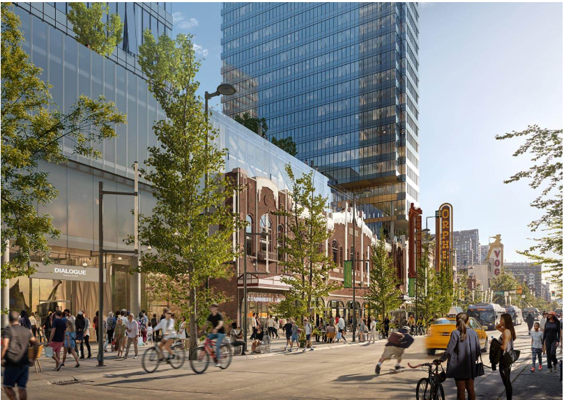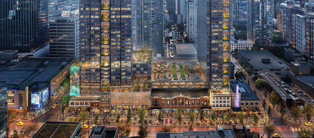计划几乎占据了整个街区,包括历史悠久、内设舞厅和台球厅的科莫多尔大楼(Commodore Building),一直延伸到市属奥芬剧院固兰湖街入口的边界线。