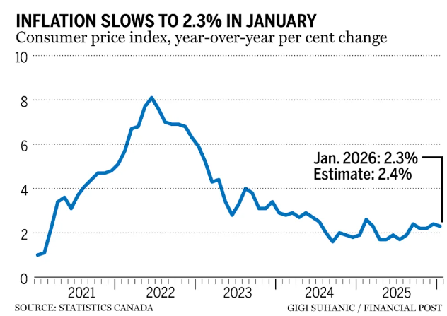 根据加拿大统计局(Statistics Canada)周二发布的消费者价格指数(CPI)数据,1 月份通胀率同比为 2.3%,低于 12 月的 2.4%,并正逐步接近央行 2% 的目标水平。如果通胀持续降温、而经济又需要支撑,加拿大央行(Bank of Canada)可能将具备降息的空间——多位经济学家如是判断。