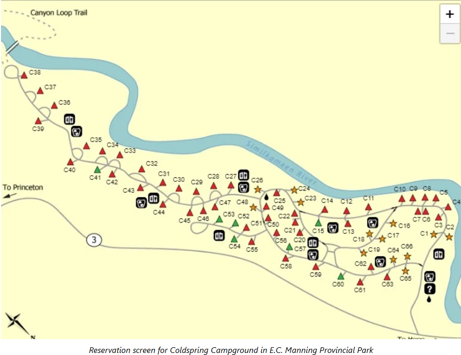 请看上面的截图示例,这是 E.C. Manning Provincial Park 内的 Coldspring Campground。在该界面中: