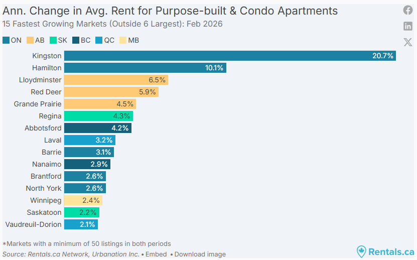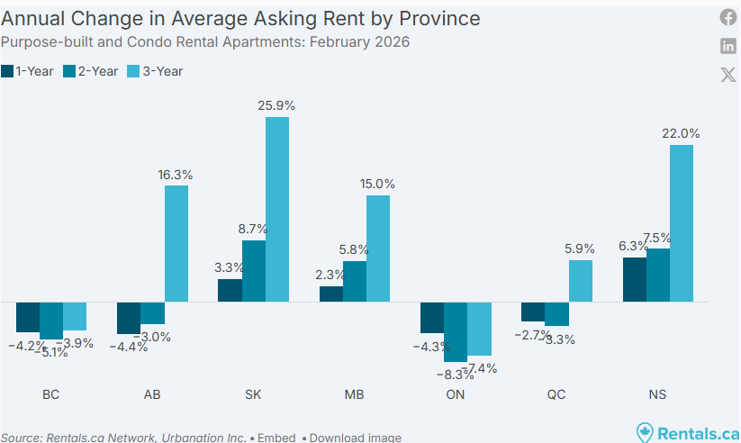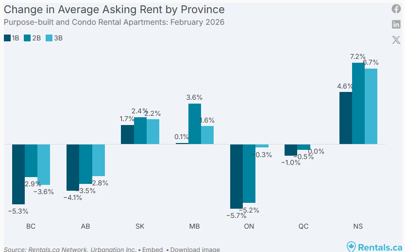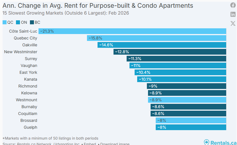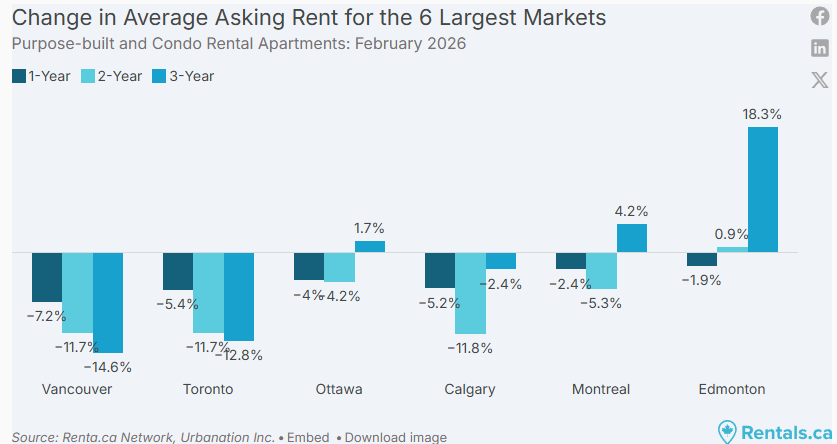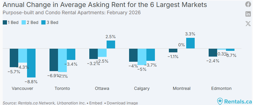 租金已连续第17个月出现同比下降,同时环比下降1.3%,这是自2020年以来2月份最大跌幅。不过,在温哥华(Vancouver)、渥太华(Ottawa)、卡尔加里(Calgary)、埃德蒙顿(Edmonton)和蒙特利尔(Montreal)等主要市场,租金出现环比上涨。