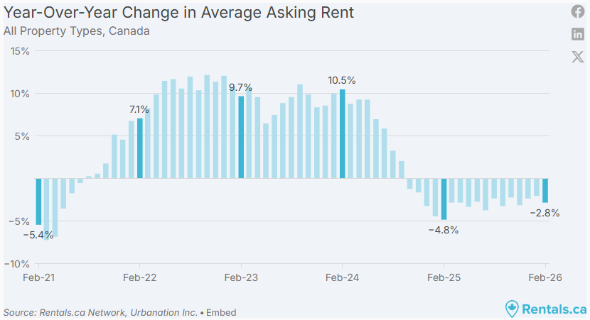 尽管租赁市场在冬季通常会放缓,但今年租金的季节性下降幅度明显高于往年。按月计算,租金环比下降1.3%,这是自2025年11月以来最大的月度跌幅,也是自2020年以来2月份最大跌幅。