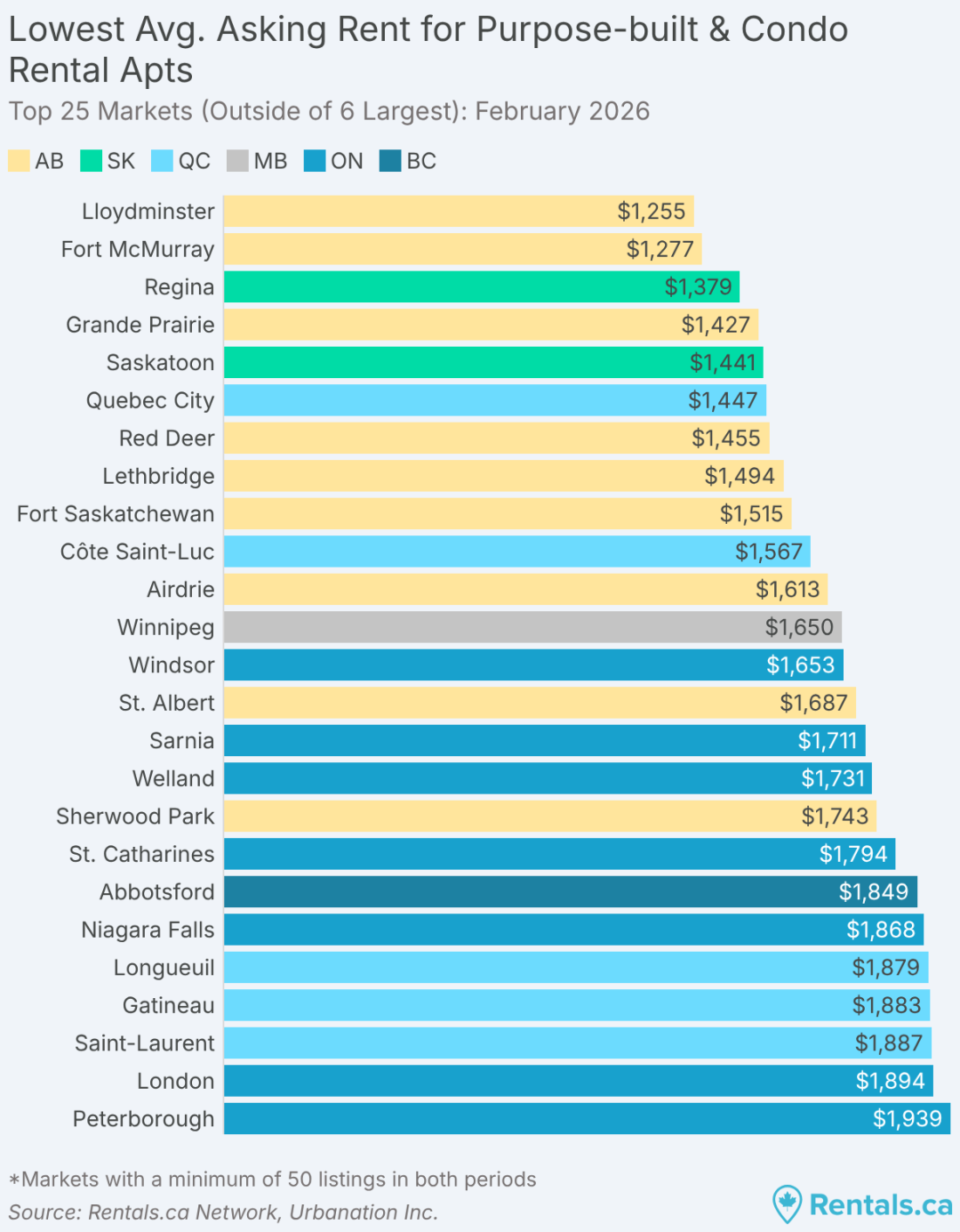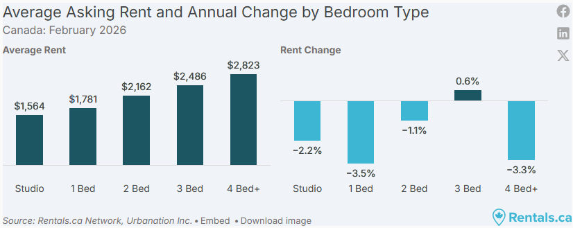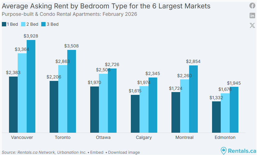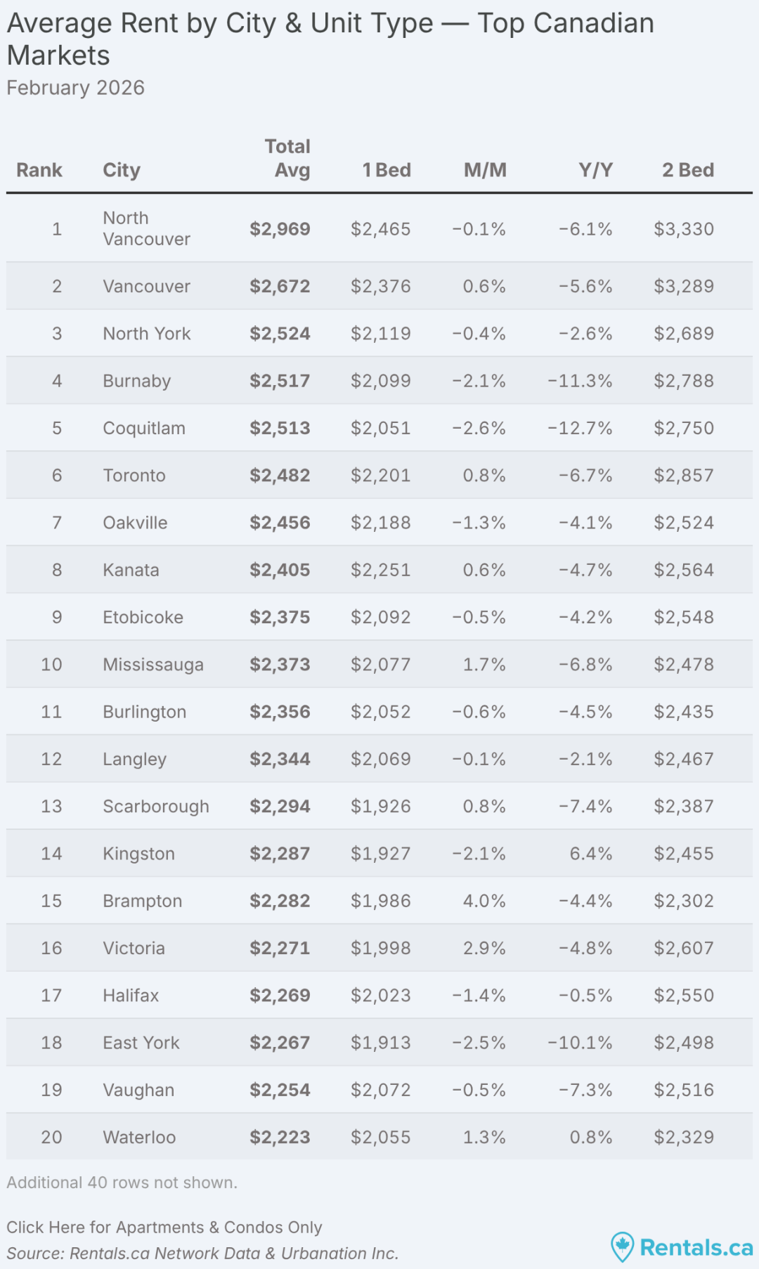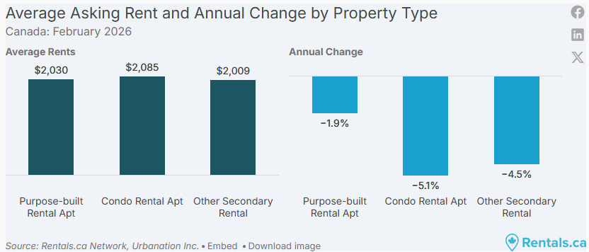 2026年2月,专门建造的出租公寓和共管公寓的平均挂牌租金为2035加元,同比下降2.4%。