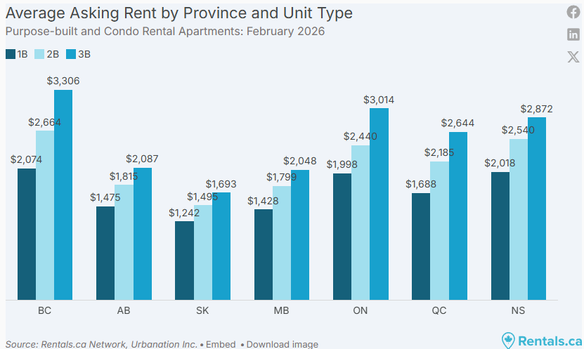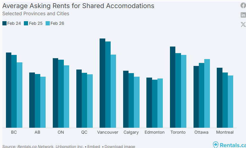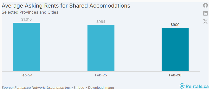 在BC省、阿尔伯塔省、安省和魁北克省,2026年2月合租房(shared accommodation)的平均挂牌租金为900加元。
