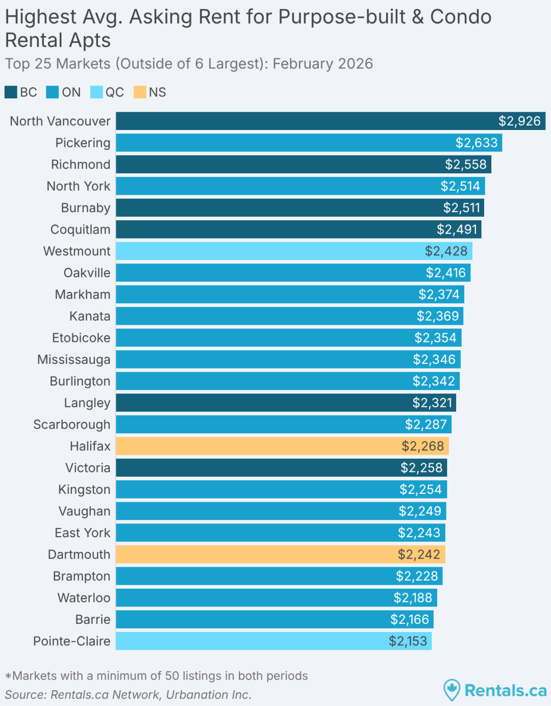 北温(North Vancouver)公寓平均挂牌租金为2926加元,在较1月略有上涨后,仍然是全国最昂贵的租赁市场。