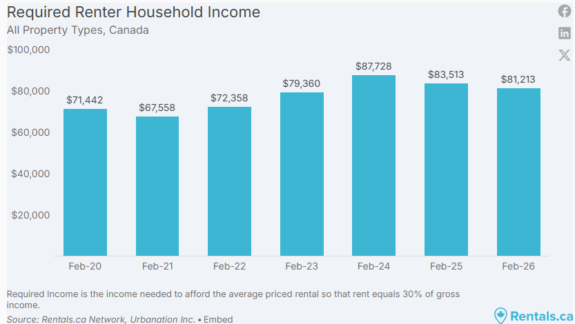 按照30%的负担能力基准计算,要负担加拿大所有房型平均租金,家庭年收入需要达到81,213加元,而2025年2月为83,513加元,2024年2月为87,728加元。