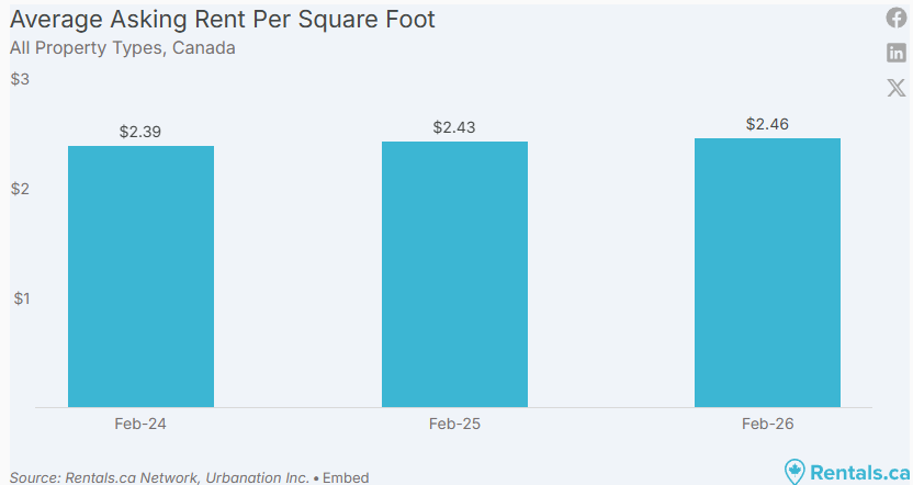 平均每平方英尺挂牌租金同比维持在2.53加元,但与2024年2月相比下降4.2%,当时平均为2.64加元。