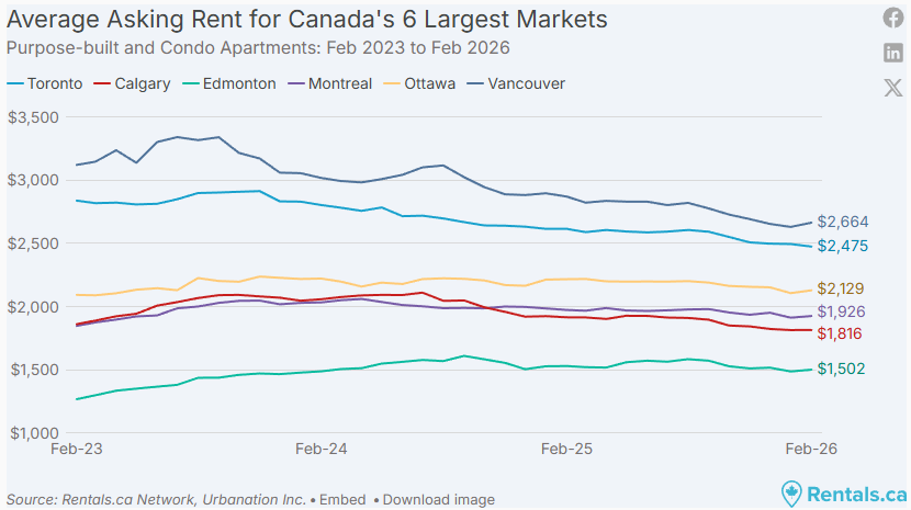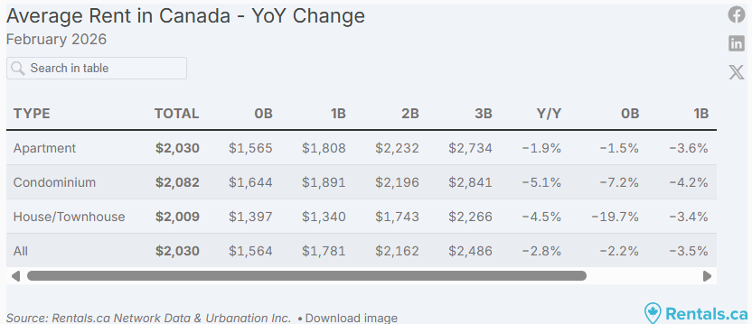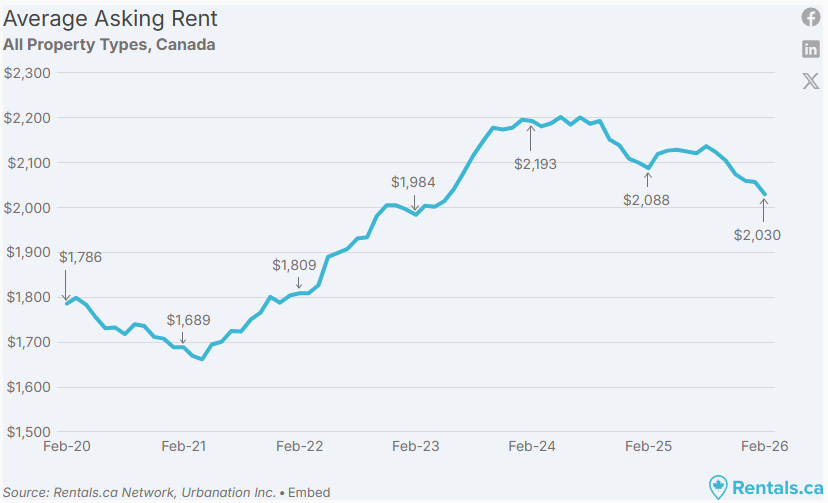 2026年2月,加拿大平均挂牌租金降至2030加元,同比下降2.8%,创下33个月以来的最低水平。