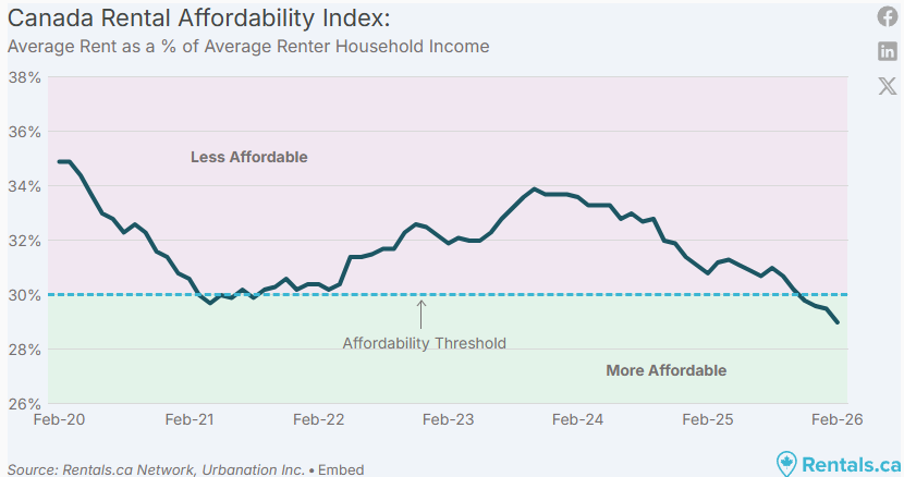 2026年2月,平均租金占租客家庭平均收入的29%,低于一年前的31%,也低于两年前的34%,并已低于行业通常使用的30%负担能力标准。