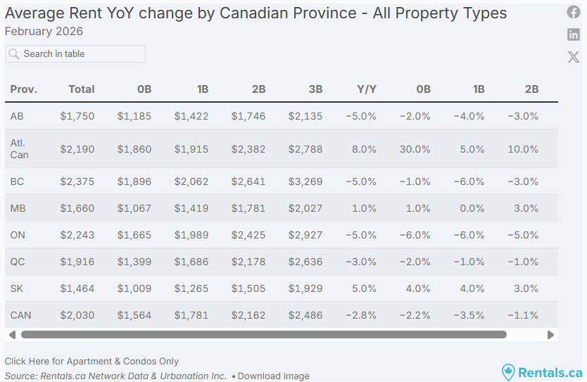 2026年2月,加拿大所有房产类型的平均挂牌租金降至2030加元,为33个月以来最低水平,同时也是连续第17个月出现同比下降。
