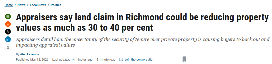 一些卑诗省的地产估价师警告称,由于Cowichan land title case引发的负面公众观感,以及外界对其影响的不确定性,可能会使判决所涉及的列治文(Richmond)地区部分私人土地的价值下跌30%至40%。