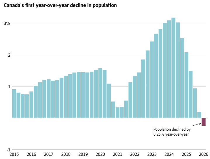 他在一份报告中写道:“即使修订可能会调整第四季度人口下降的幅度,但整体方向已经十分明确:加拿大的人口增长引擎正在迅速降温,这将对劳动力供给、住房需求以及整体经济前景产生广泛影响。”