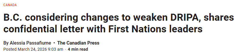 最近,卑诗省出现两宗判决,援引DRIPA支持原住民族主张,包括裁定现行矿权制度违法,以及承认考伊琴部落(Cowichan Tribes)的土地权,对省府的资源与土地管理构成压力。