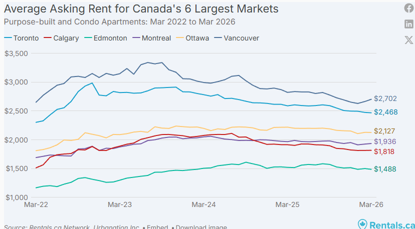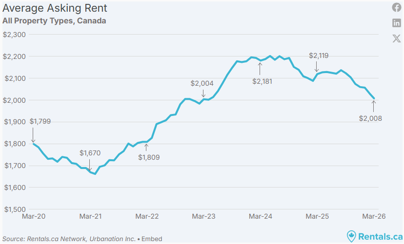 2026年3月,加拿大平均挂牌租金降至35个月以来的最低水平,为2,008加元。