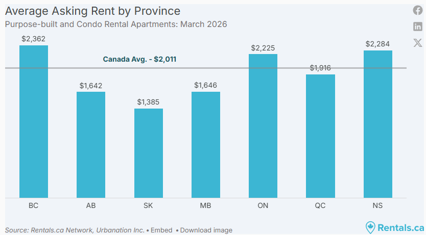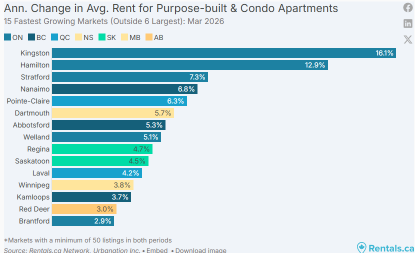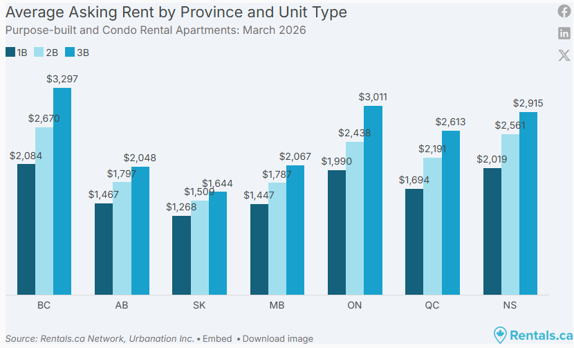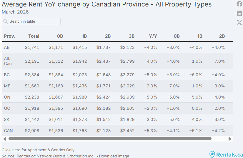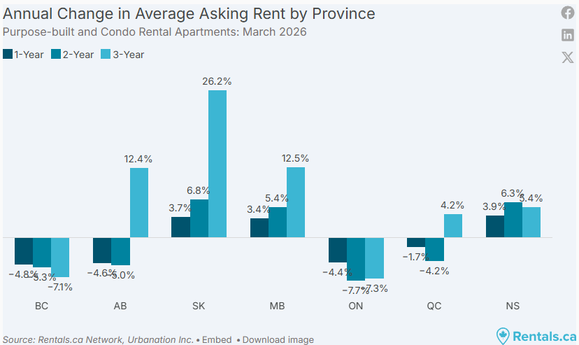尽管近期有所回落,但与2023年3月相比,阿尔伯塔省租金仍高出12.4%;而BC省和安大略省则在同期下跌超过7%。