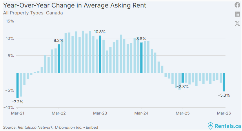 2026年3月,加拿大各类物业的平均挂牌租金降至2,008加元,为35个月以来最低,同时也是连续第18个月同比下降。与2025年3月相比,平均租金下跌5.3%,创下自2021年4月以来最大同比跌幅。这也是连续第二个月环比跌幅超过1%,继2月下降1.3%后,3月再降1.1%。与2024年5月的高点相比,租金累计下降194加元,跌幅达8.8%。