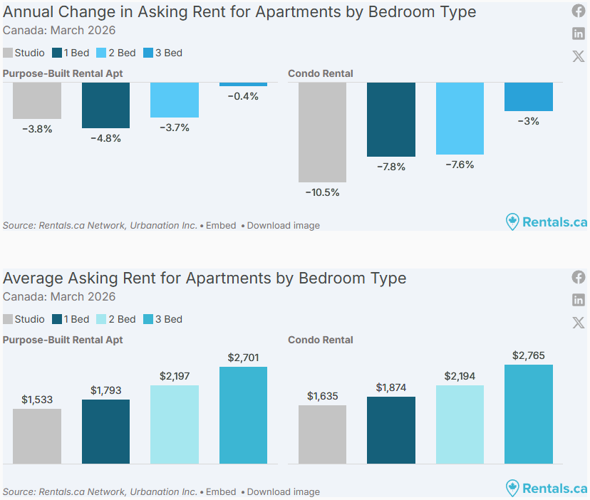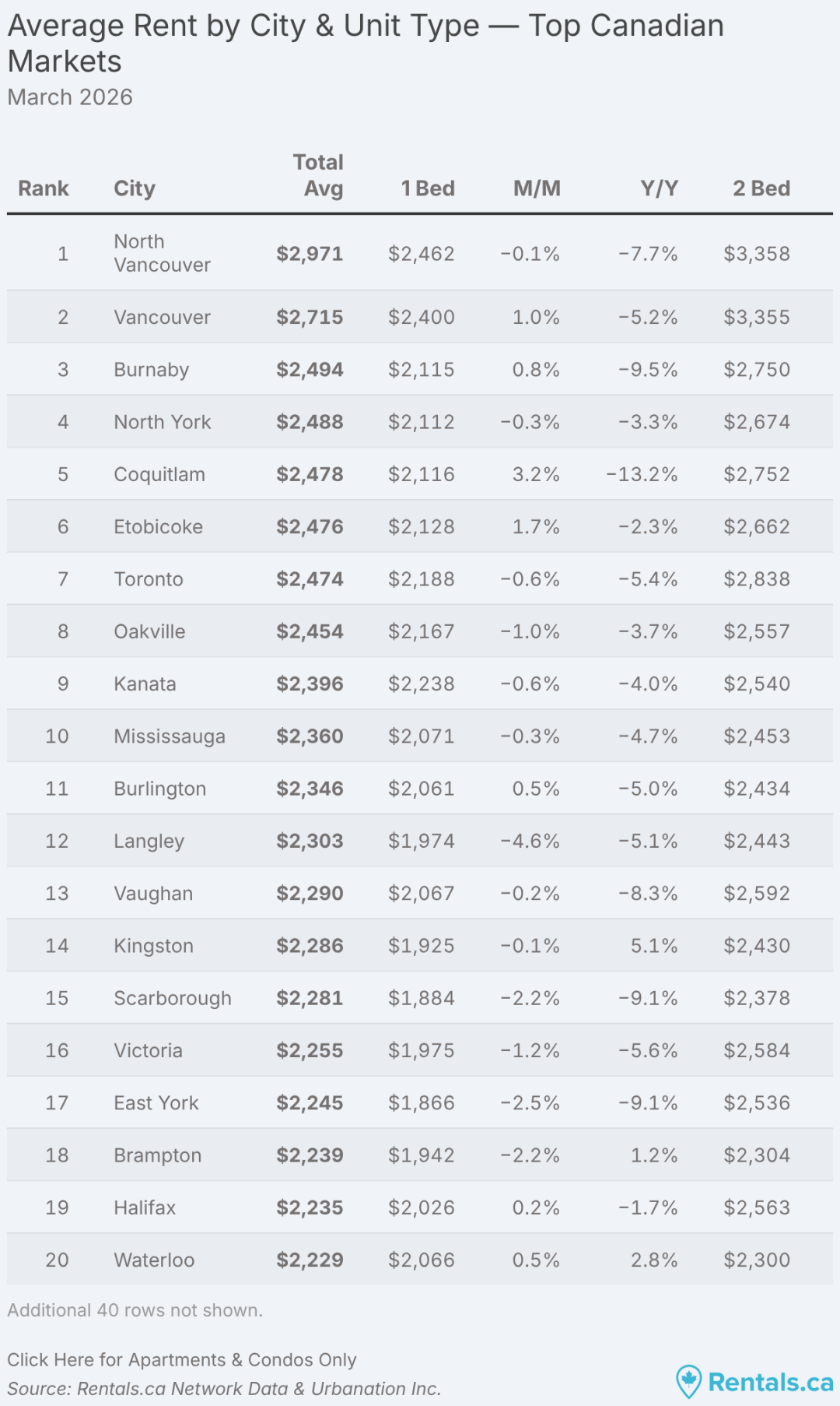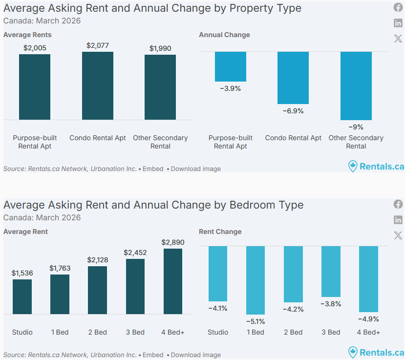 专门建造的出租物业(purpose-built rental)在年度层面表现最为稳定,平均租金下降3.9%至2,005加元,但在环比方面跌幅最大,较2月下降1.2%。