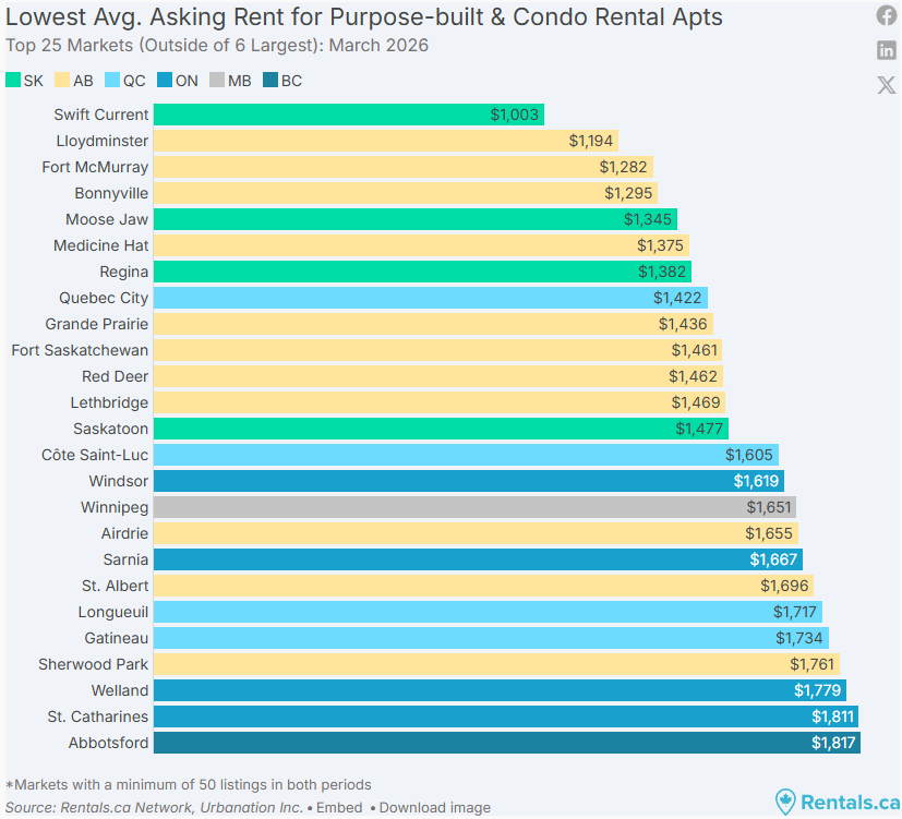 全国最可负担的大城市(人口前25)包括里贾纳(Regina)(1,379加元)、萨斯卡通(Saskatoon)(1,441加元)和魁北克市(Quebec City)(1,447加元)。